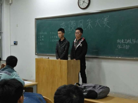 5月19日晚七点,机电工程学院在9号教学楼405室举办英语寝室风采大赛。共有机电工程系学院2015级学生会10位部长作为评委和2016级80名同学参加本次大赛。