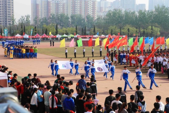 4月19日,滨州学院第十四届运动会在运动场隆重拉开序幕。机电工程学院学生方队在运动场参加运动会开幕式,运动健儿们参加各项比赛。