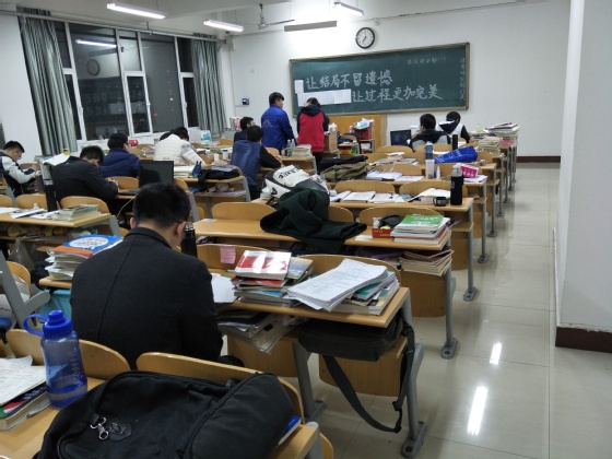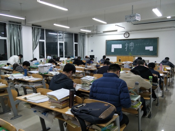 自2017年5月3日他们向学院递交入住学习示范楼申请书,至2017年12月25日考研结束,一共225天,5400个小时,7个月多的时间,他们一直相互鼓励,一起克服重重困难。在酷热的夏天,他们流着汗吹着风扇坐在自习室学习;在寒冷的冬天,天还不亮他们就顶着寒风走向教室;为了不打扰班级其他同学上自习,他们十个人一起挤在六楼楼道里背书;为了节省回宿舍和来教室的时间,他们每天中午只趴在教室的桌子上眯一会。早上带着从食堂买的早餐边走边吃,与时间赛跑;白天在自习室里一坐就是几个小时,埋头苦学,晚上等八教的灯都熄灭,也不肯离去,这几乎是他们每个人的生活写照,正是这样的付出与拼搏,让他们的理想之花在人生最美好的青春时光绚烂绽放。