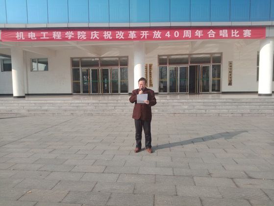为庆祝改革开放40周年,进一步活跃校园文化氛围,加强学风建设。11月25日上午9点,机电工程学院于九教广场举办以“不忘初心,砥砺前进”庆祝改革开放四十周年为主题的合唱比赛。此次比赛由文艺部主持,18级全体同学参加,机电工程学院党总支书记张永胜、副书记王丕琢以及辅导员宋立军、靳雪银、纪建茂老师作为评委给各个参赛班级打分。