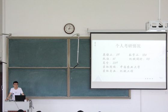 第一环节由宋立军老师为考研学生作动员,他指出当今社会越来越重视学位的含金量,举办考研动员大会是学院对考研工作的高度重视,同时他希望参加考研的同学认识到考研的重要性,提高自信心,规划好自己的目标,持之以恒。第二环节由2015级考研成功的张永辉、马昌武、陈笑天、杨莹攀、王方方五位同学向大家分享了自己一年以来的研究生感触以及当时的考研历程与经验。他们通过择校问题、学习计划向大家展开讨论,他们的建议是应结合自身实际情况,准确定位,报考合适的学校,专业的选择,切勿好高骛远。了解大概考试科目的框架,知道自己的强弱项,做历年真题查漏补缺。考研前将知识点再过一遍,知识点烂熟于心,做题巩固。第三环节由周新国教授介绍了我校考研情况,并从自身出发讲述了对考研的认识。强调了考研要有明确目标,坚定的决心,除此之外还需要有健康的身体以及稳定的心理素质。适当的给自己减压,劳逸结合。还分享了考研的一些小技巧,鼓励大家甩掉思想包袱,认真备考,全力以赴。第四环节由张永胜书记做总结,他希望虽然考研之路艰难而漫长,大家仍能不忘初心,砥砺前行,尽快端正态度,明确目标,用信心、恒心、决心和平常心来积极面对考研。
