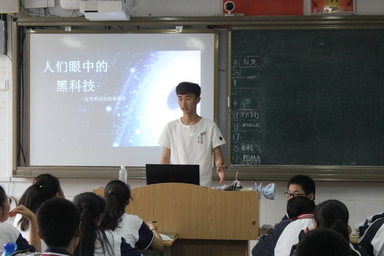 活动开始,孙建国同学就“哪些同学想要当科学家发明家”“怎么样才能成为发明创造的人”等问题与第六中学的同学们进行互动。小小的问题点燃了同学们对发明创造的激情,在预留的十五分钟的互动环节,同学们表现得极其踊跃,争先恐后提出了自己的发明创造想法,现场气氛十分活跃,足足半小时才停不下来。随后,孙建国同学介绍了偶然发现法、移植发明法、挖掘潜力法、逆向思维法等多种发明创造的方法,并对偶然发现法、联想法、挖掘潜力法用通俗易懂的语言,深入浅出地为同学们进行讲解。他就“你们自己觉得自己应该做着什么改变来获得成功成为你想成为的人”问题与同学们进行讨论,同学争相讲述自己的想法,诠释了发明并不只是科学家的“专利”,要从身边小事做起,注意观察生活。最后,他以PPT文字图片的形式向同学们展示了古代与现代的黑科技发明,并详细展示了学院三个实验室的发明,充分调动了同学们的积极性,为将来他们的创造发明打下了良好的基础。