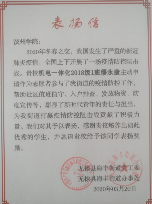 在这场举国同心、众志成城的全面疫情阻击战中,无数防疫工作人员用坚定的决心和无限的热忱,为疫情防控工作的顺利开展和有序进行贡献出了自己的一份力量。疫情暴发以来,机电工程学院18机电专1班学生缪永康积极响应党的号召,主动申请作为志愿者参与社区疫情防控工作,协助社区开展值班值守、入户排查、防疫宣传,工作期间,认真负责,耐心细致,表现突出,所在街道特向学校发来表扬信进行表扬。
