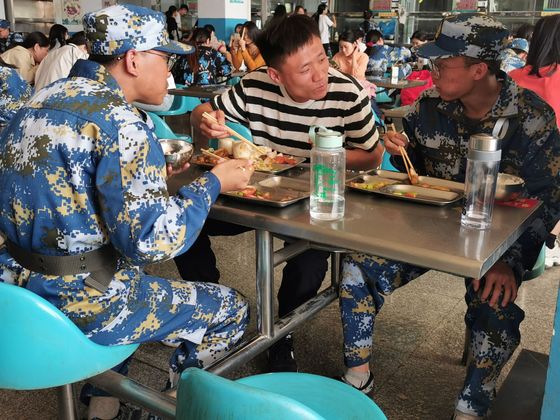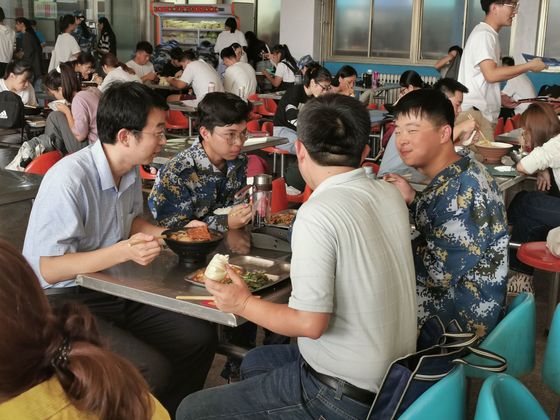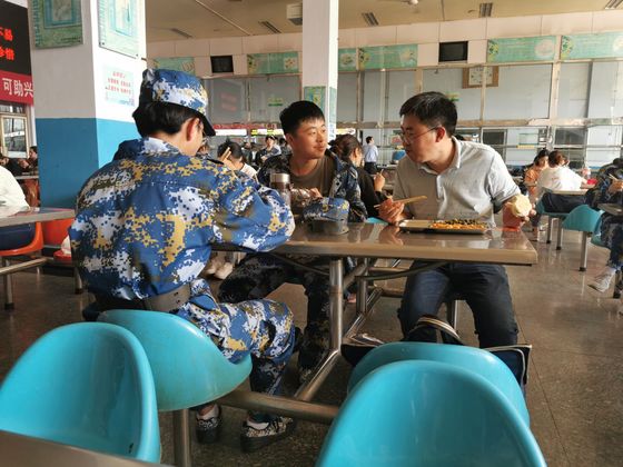 辅导员与学生在食堂一同就餐,按照就餐要求排队点餐后,四人围坐一桌,一边分享食堂美食一边畅谈军训心得。师生全称交谈氛围和谐融洽,在轻松的就餐过程中老师与学生分别在学习、心理、情感、食堂饭菜质量等话题进行直接的交流、沟通,充分拉近师生间的距离;同时也便于了解掌握贫困学生日常生活情况,为精准资助扶贫工作提供更加实际的依据。