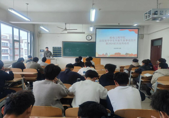 为进一步激发学生参军热情,营造浓厚参军入伍氛围,持续不断做好征兵工作,12月11日,机电工程学院召开2024年退役士兵军旅生涯事迹宣讲会暨征兵宣传动员大会。会议由党总支副书记王春磊主持,邀请了学院退役复学学生司浩东、杨吉超、王瑞东为同学们宣讲军旅生涯,2023级新生参加。