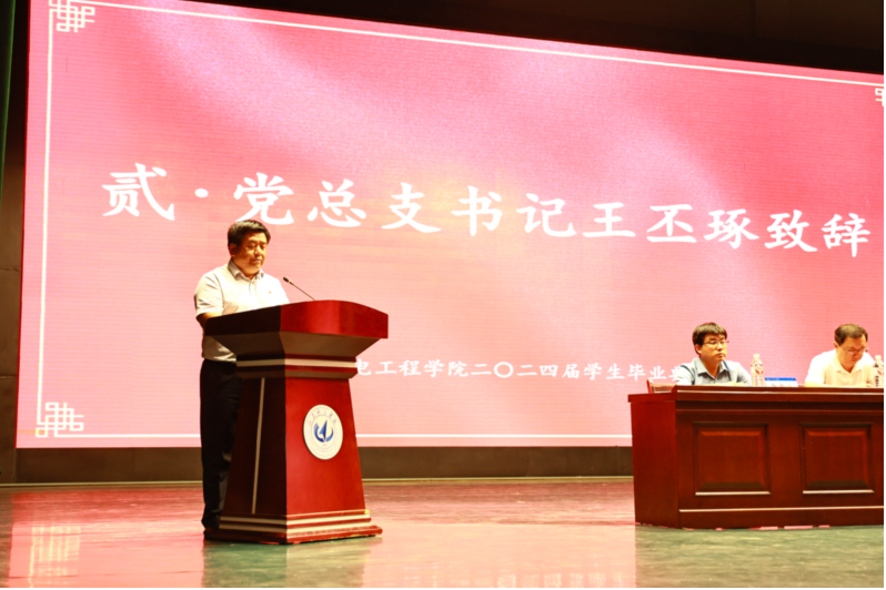 毕业典礼在庄严雄壮的国歌声中拉开帷幕。党总支书记王丕琢代表学院和全体师生,向圆满完成学业的毕业生表示热烈祝贺和美好祝福,对各位老师和家长的辛勤付出表示衷心的感谢。他向全体毕业生提出希望,一要勇于承担责任,敢于担当作为,为实现中华民族伟大复兴的中国梦贡献力量。二要保持谦逊与敬畏,永远保持学习的热情,以更加扎实的专业素养和更加广阔的视野去迎接未来的挑战。三要勇于创新实践,不断提升自己的综合素质和能力水平,追求卓越,勇攀高峰,在各自领域取得更加辉煌的成就。