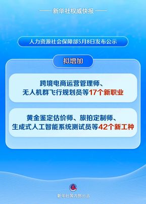 同时新增黄金鉴定估价师、旅拍定制师、智慧仓运维员、睡眠健康管理师、生成式人工智能系统测试员、烧烤料理师、服务犬驯养师等42个新工种。