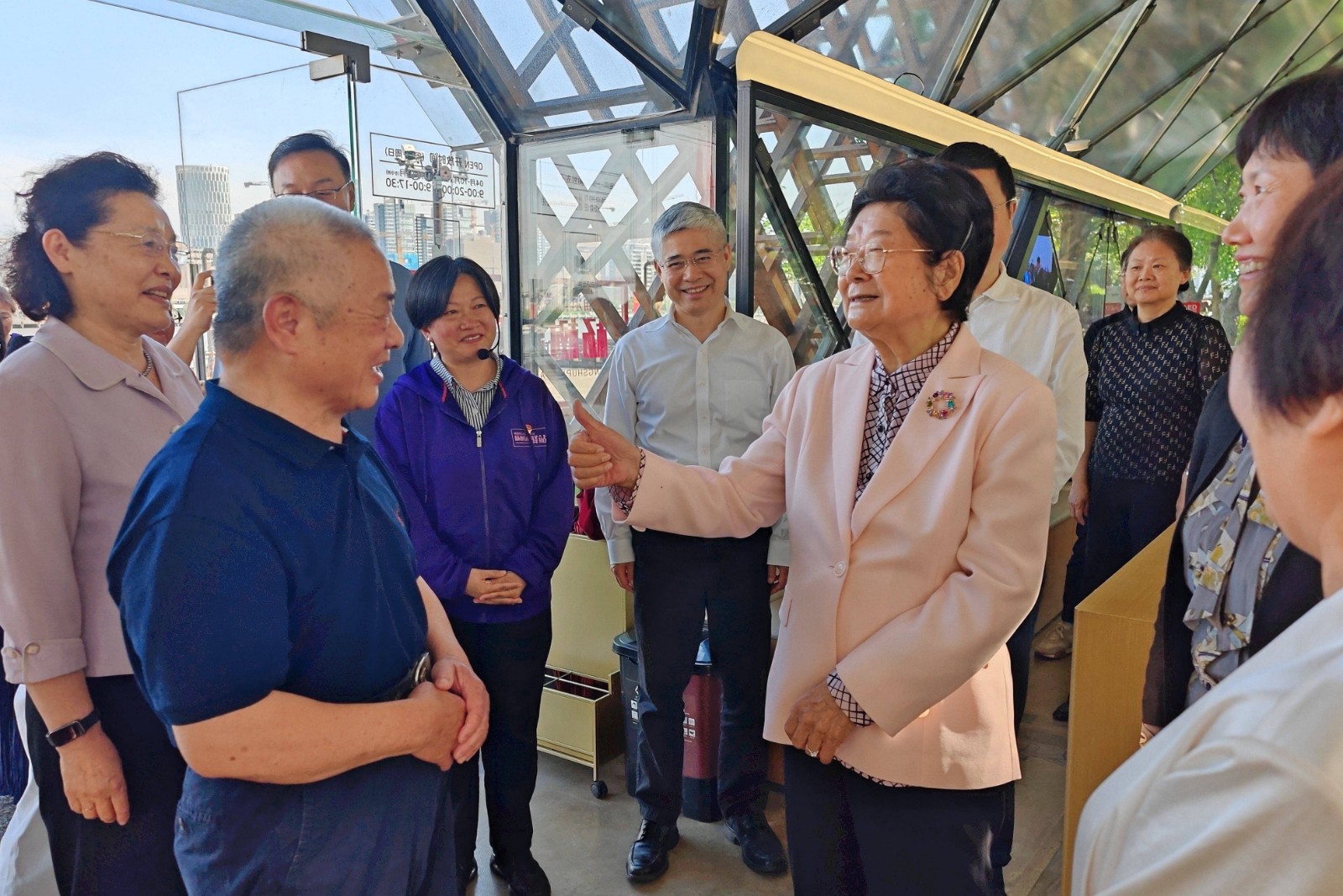杨浦滨江人人屋党群服务站,曾是2019年11月习近平总书记考察杨浦滨江,首次提出“人民城市人民建,人民城市为人民”重要理念的地方。习近平总书记与老劳模黄宝妹亲切交谈,称赞她是国家发展的“见证者、参与者、奉献者”,鼓励她“多向年轻人讲一讲,坚定他们对中国特色社会主义的道路自信、理论自信、制度自信、文化自信”。此后,杨浦区“老杨树宣讲汇”应运而生。顾秀莲在这里亲切看望了正在参加活动的杨浦区“老杨树宣讲汇”部分老同志,听取了他们积极参加关心下一代工作,向青少年开展红色宣讲、传承红色基因,助力人民城市建设的心得体会,对他们在关心下一代工作中作出的突出贡献、取得的优异成绩点赞,并勉励他们再接再厉,引领和带动更多的老同志参与到关心下一代的工作中来,为党和人民培养担当民族复兴大任的时代新人作出新的贡献。