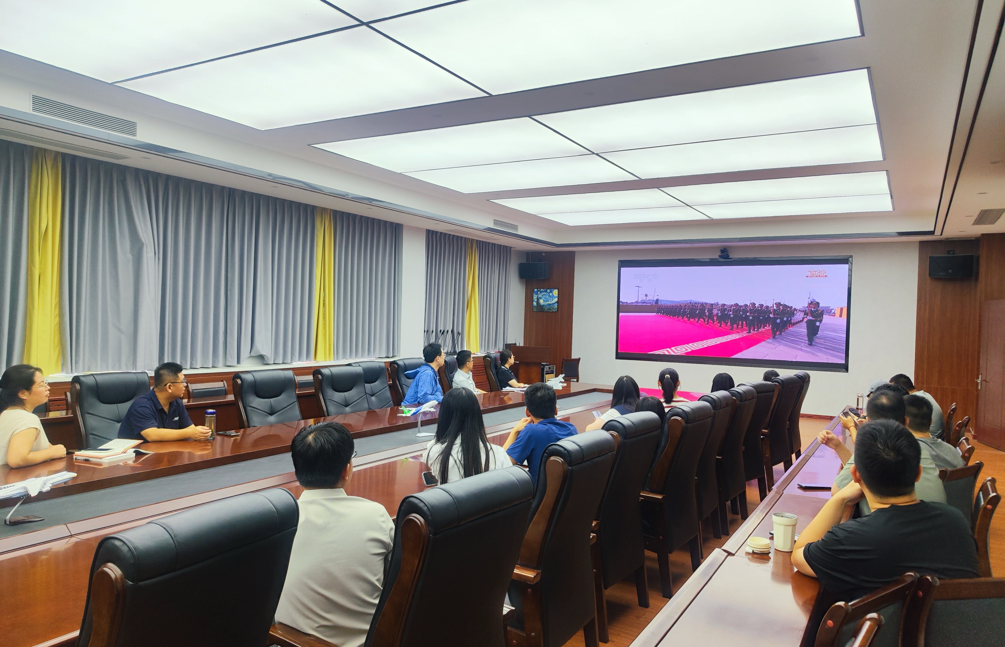 9时许,阅兵仪式正式开始,大家全神贯注观看,认真聆听习近平总书记的重要讲话,共同见证一个个受阅方阵迈着整齐划一的步伐通过天安门广场,感受着磅礴的气势和强大的力量。抗战老兵庄严敬礼的画面、“人民必胜”的标语闪耀广场,受阅部队整齐的队列和先进的武器装备,令大家倍感振奋,深受震撼和教育,现场一再响起热烈掌声。