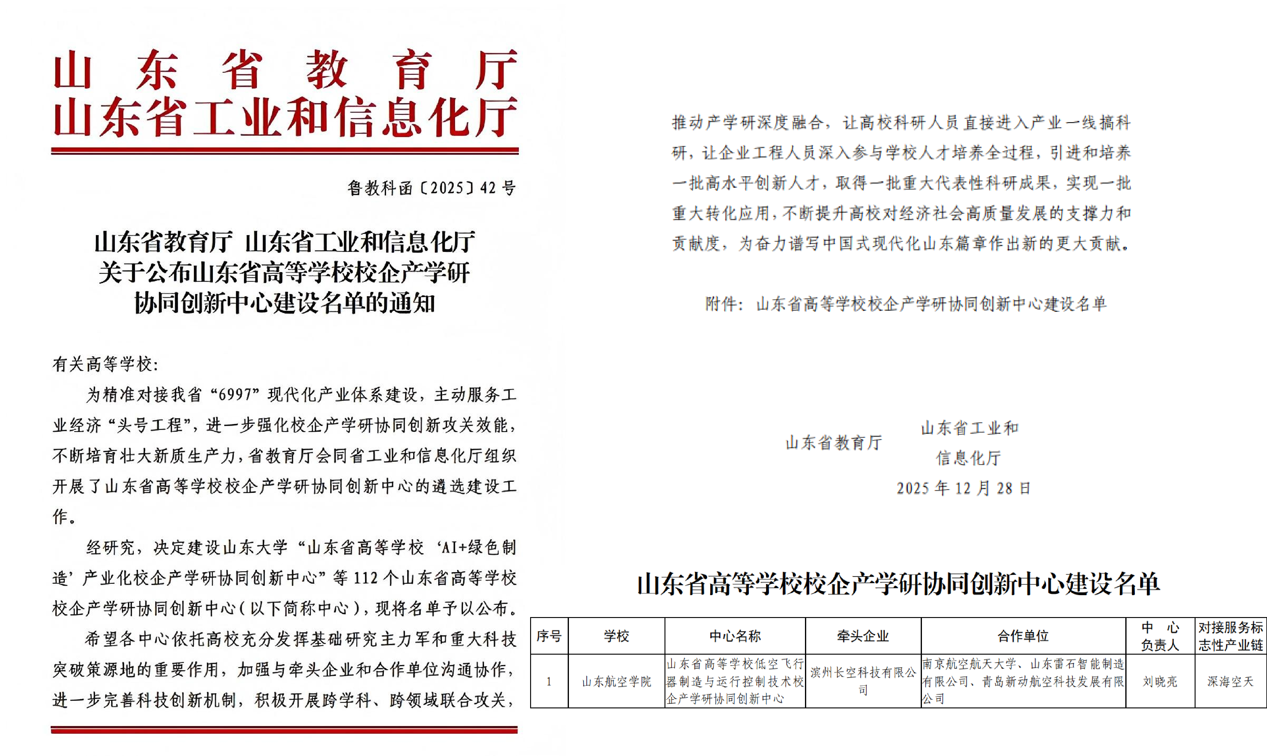 近日,山东省教育厅与山东省工业和信息化厅联合发布了《关于公布山东省高等学校校企产学研协同创新中心建设名单的通知》(鲁教科函〔2025〕42号),我院牵头申报的“山东省高等学校低空飞行器制造与运行控制技术校企产学研协同创新中心”成功获批,标志着我院在服务区域产业发展、推动产学研深度融合方面迈出坚实一步。