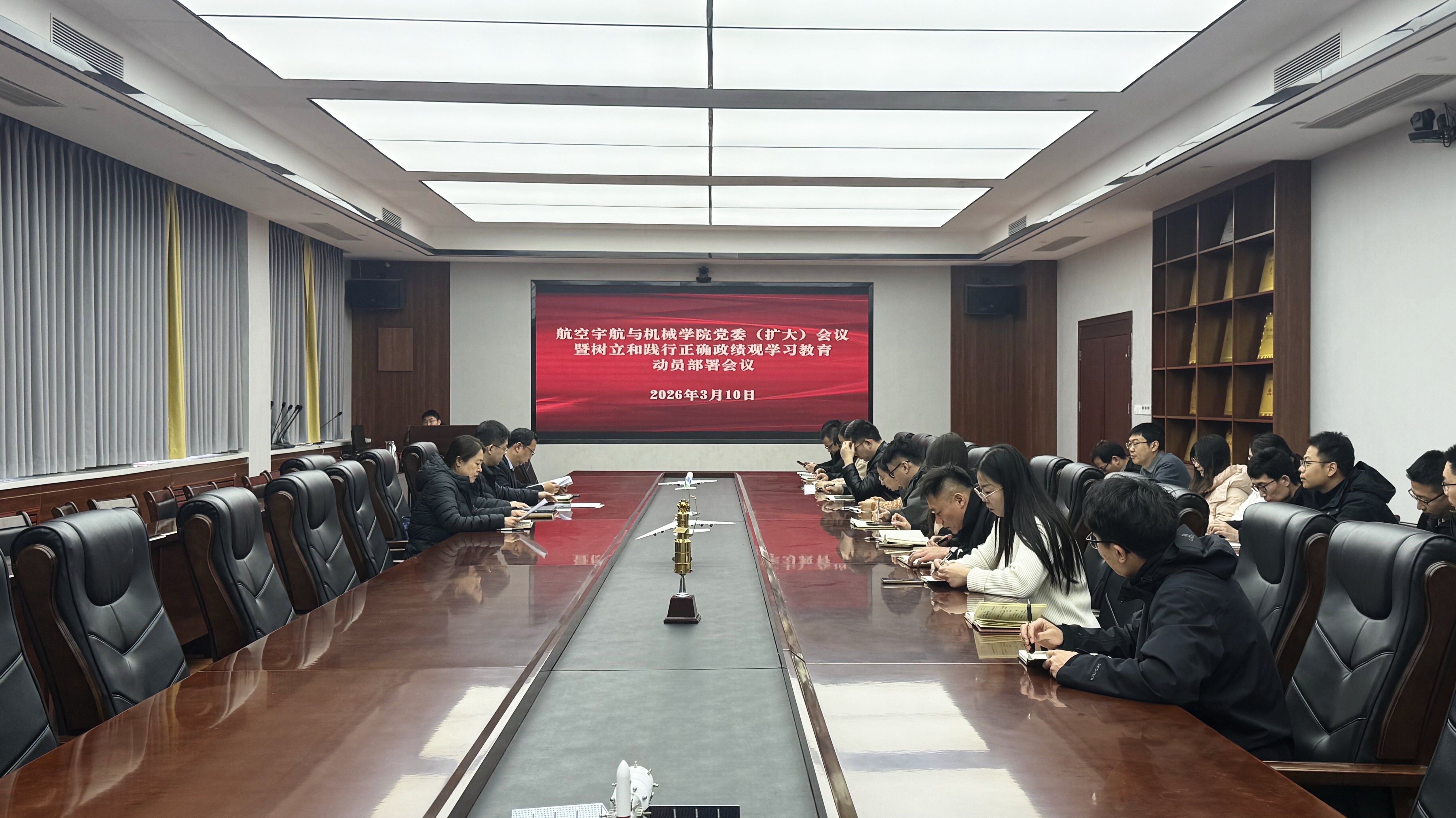 会议强调,要紧密结合航空宇航与机械学科特点,一体推进学查改,精准落实学习教育重点任务,推动学习教育与学院工作深度融合、走深走实。一是要在“学”字上求深,把学习贯彻习近平总书记关于政绩观的重要论述与关于航空航天强国的重要论述相结合,引导党员干部从思想根源上厘清政绩导向,把理论学习成果转化为干事创业的动力;二是要在“查”字上求实,围绕学科建设、人才培养、师资队伍建设、学生管理等核心工作,聚焦师生急难愁盼问题,深入自查自纠,找准工作短板、明确改进方向,坚决杜绝脱离实际、急功近利的形式主义做法;三是要在“改”字上求效,把问题整改与学院重点工作紧密结合,紧扣学校“两大攻坚”任务和“11246”工作体系,将整改成效体现在学科内涵提升、人才培养质量提高、师生满意度提升上;四是要在“制”字上固本,结合学院工作实际,完善学科建设、人才培养、绩效考核等相关制度,健全科学决策、高效执行机制,筑牢防范政绩观偏差的制度防线;五是要在“开”字上求广,坚持开门搞教育,广泛听取师生意见建议,主动接受师生监督,把师生满意度作为衡量工作政绩的最终标准,凝聚起全院上下干事创业的强大合力。